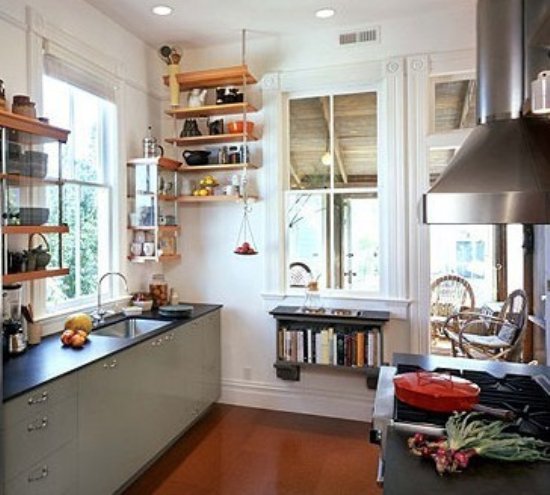 擱架設(shè)計(jì)常常出現(xiàn)在廚房中,用于收納各種碗碟或是調(diào)料,但空間遠(yuǎn)遠(yuǎn)不夠用,那就不要吝嗇擱架的使用,將較高或者較矮的墻壁處增添幾排擱架,并不會(huì)覺得廚房擁擠。