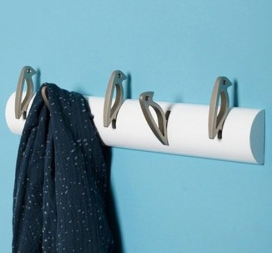 平凡的鉤形掛鉤用趣味造型的金屬鳥兒取代,且鳥形掛鉤可以前后移動,掛上東西時往后仰,不掛時往前靠,從而形成層次不齊的停留狀。