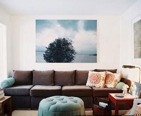 大幅的風(fēng)景畫可以擴(kuò)充人的視野,讓客廳顯得更加空闊,讓人心情開闊。相比照片墻,這樣的裝飾畫更加大方典雅。棕色的絨布沙發(fā)沉穩(wěn)大氣,與裝飾畫相輔相成。