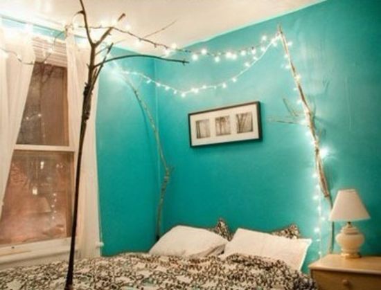 DIY一個樹枝形床架,再樹枝上纏繞上零星小燈,打造出夢幻森系臥房。