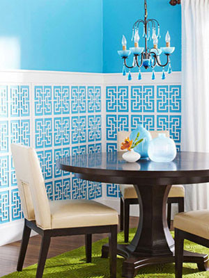 冷色調。夏日里最常用到的元素,墻面涂刷成湖藍色,再配以復古懷舊造型的雕木護墻板,在四壁中的留白令室內色彩看起來有變化,清爽的配色涂裝出透氣又涼爽的空間。