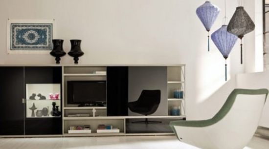 造型極其簡(jiǎn)單的一組電視柜,整體為一個(gè)大型矩形,左邊的展示柜,明亮的展示了主人收集而得的藝術(shù)瓷器,左側(cè)的移門采用鏡面設(shè)計(jì),可隨時(shí)將電視隱藏起,電視柜頂部還添置了民族布藝背景,擺脫了空洞的上部分墻壁。