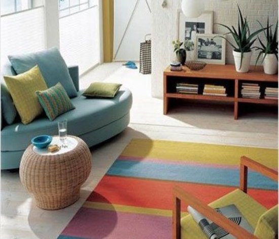 不要被傳統(tǒng)的思維絆住了腳,小小的沙發(fā)也能打造出不凡的客廳空間。選用圓滑邊角的小雙人位沙發(fā)(直角的沙發(fā)或許就沒有這樣的效果),留出大片活動空間。沙發(fā)上層層疊疊的抱枕和地面上多彩條紋的地毯,都讓這個小客廳充滿層次感。