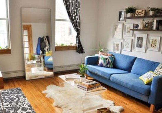 一個(gè)愜意的藍(lán)色沙發(fā)搭配一個(gè)通透的玻璃小茶幾