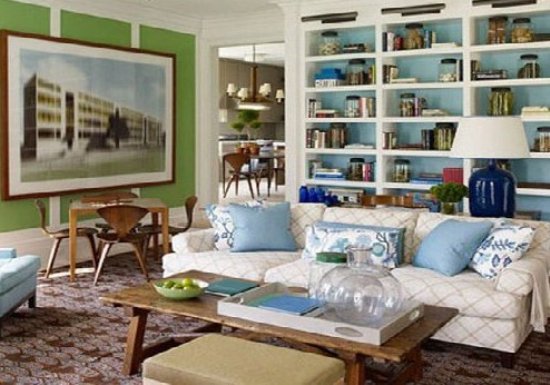 格子圖形總能讓人覺得大方又有氣質,格子布藝沙發(fā)營造簡約的大家風范沙發(fā)區(qū),而背后整體的格子裝飾架也讓人眼前一亮。