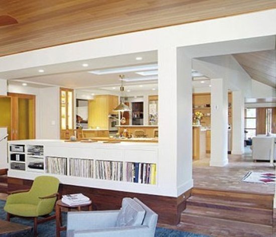 用來(lái)分開客廳區(qū)與餐廳區(qū)的,是一個(gè)低矮的隔斷墻,這樣的設(shè)計(jì)既能讓空間有效劃分又能保持寬敞感,而隔斷墻的功效遠(yuǎn)不止此,隔斷的主體被全部鏤空,劃分出不同的收納格局,特別是豎格,可將A4大的書籍、雜志整齊收入其中。