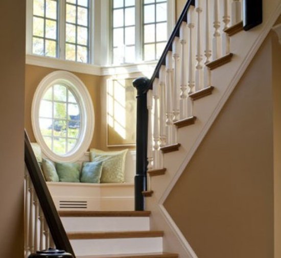 樓梯中間平臺(tái)的圓形飄窗十分唯美,依靠于次定是種享受,因此,在緊靠窗的位置設(shè)計(jì)一排座椅,放上合適顏色與舒適的靠包,座椅要是能采用能夠用于收納的,那最好不過(guò)了。