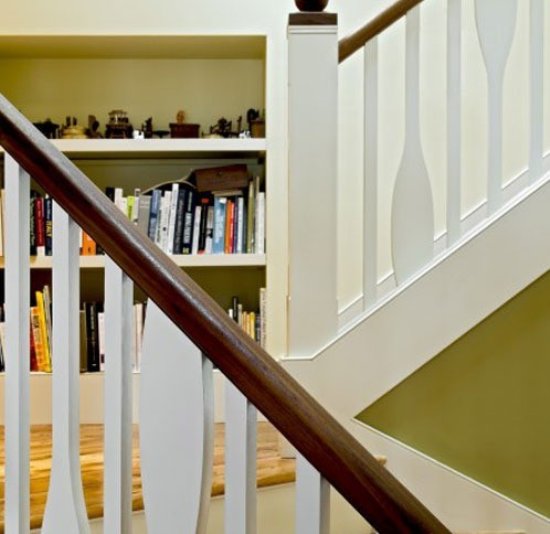 這個樓梯中間平臺面積較為小,于是設(shè)計(jì)師在對墻壁打起來了主意,將墻壁挖進(jìn)幾寸,聰明的要到一個能夠設(shè)計(jì)成書架的空間,樓梯轉(zhuǎn)角平臺變成了很好的藏書區(qū)域。