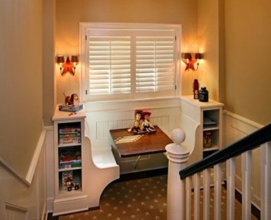 這個(gè)案例中,我們能夠看到樓梯中間平臺(tái)實(shí)際上擁有一個(gè)較為寬敞的空間,聰慧的設(shè)計(jì)師將其打造成一個(gè)緊貼樓梯飄窗的就餐小區(qū)域,餐臺(tái)是極為節(jié)約空間的掛壁式,而2排座椅是與椅背后的收納架為一體,為1-2平的小空間無(wú)限擴(kuò)容。