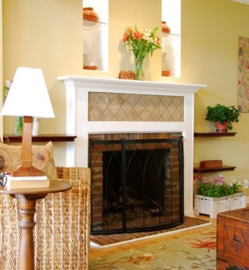 擱板上除了能放上藝術(shù)裝飾品,還能為植物引入室內(nèi)提供絕佳場所。在突兀的火爐兩旁設(shè)計(jì)兩排擱板作植物架,方式各式盆栽或插花,給客廳背景墻增添綠意。