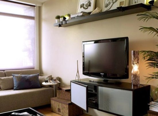 在客廳狹小的情況下,小尺寸的家具更能合理利用每一寸空間。這款矮柜單元內(nèi)部帶有分層的儲物空間,物品可以分門別類收納起來。上面搭配掛墻安裝的木質(zhì)擱架,除了放置雜志書籍、CD盤片等,還能起到一定的裝飾作用。