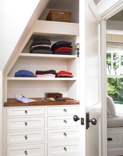 樓梯下、閣樓下,經(jīng)常存留這樣的畸形空間,稍不留意,并錯(cuò)失了一塊絕好的收納區(qū)域。像這樣,給畸形空間量身定做一個(gè)收納柜,傾斜部分用不同長短的擱架填補(bǔ),下端則為抽屜收納。