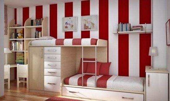 收納型的雙層床,特別設(shè)計(jì)的造型,讓小戶型再也不擁擠。紅白條紋的主體裝飾,讓整個(gè)臥室看起來(lái)干凈脫俗,所有的強(qiáng)大收納功能也都暗藏其中,各顯神通。