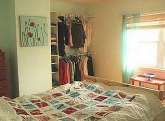 上下兩層的鋁制晾衣桿編排,讓原本衣物的有限收納空間多出了一倍的收納量。旁邊宜家式的多格收納柜,可以將小件衣物整齊疊放進去,而長款大件的衣服則可以掛在外面。