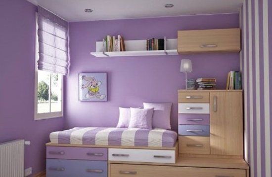 女孩子總是有太多能夠讓臥室凌亂起來的東西了,稍微不注意,本來已經不大的空間就顯得更加擁擠了。推薦這款連柜式的淡紫色系單人床,精細的分格設計,讓你的一切東西都各歸各位吧。
