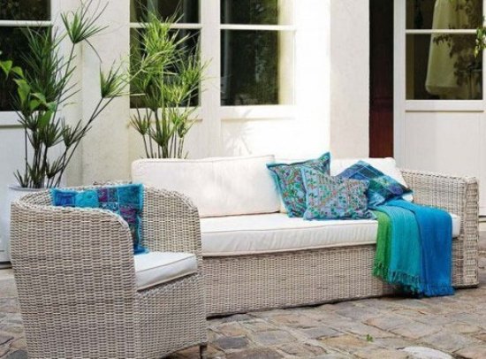 石板鋪成的地板,使這個(gè)空間更顯出自然原始味道。隨意地?cái)[放上兩個(gè)沙發(fā),形成自然而悠閑的味道。藍(lán)色的靠墊,給白色的主色調(diào)增加了亮麗的色彩。