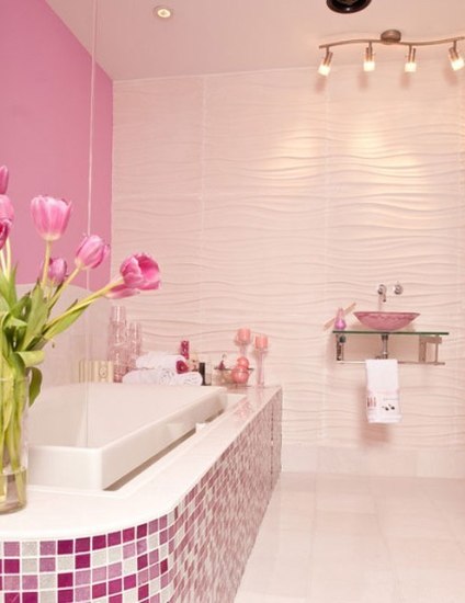 粉色系是女生的最愛,如何打造一款女生專屬的衛(wèi)浴間?用粉色作裝飾是很不錯的選擇,墻面由淺粉色與深粉色搭配裝飾,連玻璃洗面盆也采用粉色,而浴缸表面所鋪貼的馬賽克瓷磚,由淺粉、深粉、白色組成,營造出浪漫甜美的氛圍。