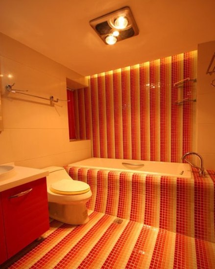 馬賽克瓷磚的美妙之處在于它能像一支畫筆一樣鋪設(shè)出精致而美麗的圖案。案例中馬賽克瓷磚,以紅色的漸變條紋圖紋鋪貼,從墻壁一支延伸到浴缸外側(cè)繼而到整個(gè)地板,營造出極為魔幻的視覺效果。