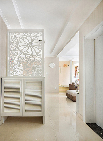潔白無瑕的鏤空玄關(guān)像蕾絲一樣甜美可人,還帶著一個實(shí)用的收納柜。更多精彩戳這里