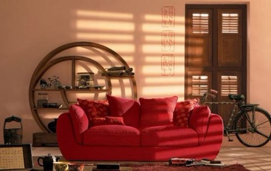 沙發(fā)色彩運(yùn)用傳統(tǒng)的中國(guó)紅,其背后還放置了一件明清式樣的家具,留白的墻面上印有書畫落款。因中式風(fēng)格的家具古板,缺少現(xiàn)代氣息,因此只能在家居中點(diǎn)綴之用。