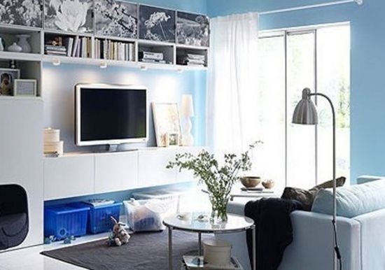 淺藍(lán)色的墻面溫和又清透,搭配白色的客廳家具、白色瓷磚地板,整個(gè)空間顯得特別清爽。電視柜和收納柜一體化設(shè)計(jì),讓它成為了這個(gè)小客廳的一道風(fēng)景線。座位旁邊的落地?zé)艉托〔鑾咨系木G植都是客廳最好的點(diǎn)綴。