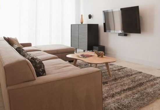 小空間里,越少的家具越能給人寬敞的視覺。只要一個(gè)大大的沙發(fā),搭配一個(gè)圓滑的木質(zhì)小茶幾,這個(gè)沙發(fā)區(qū)寬敞又舒適。掛墻的液晶電視也為地面減輕了負(fù)擔(dān),旁邊的木質(zhì)收納柜可以放些常用的客廳用品。