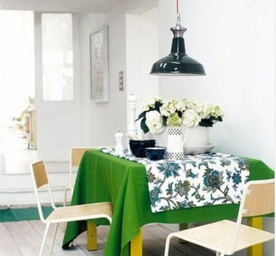 把小餐桌靠墻而放,節(jié)省了不少空間。草綠色的餐桌底布和帶大花朵圖案的餐桌布相搭配,營(yíng)造出了濃濃的田園氣息。
