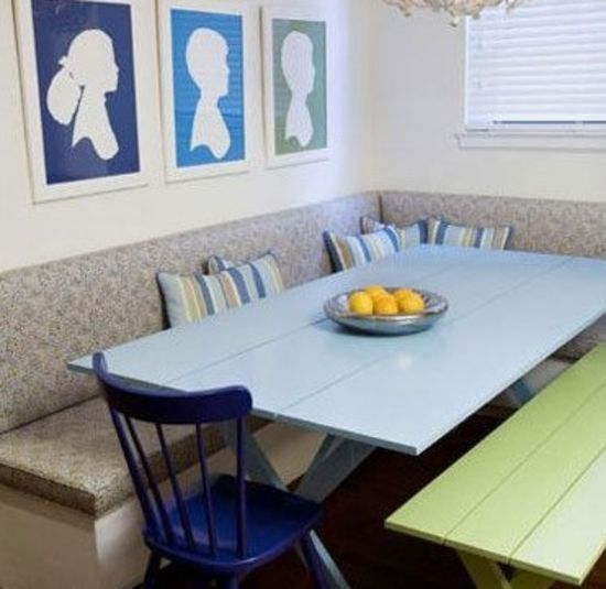 【淡藍(lán)色的木質(zhì)餐桌和草綠色的木質(zhì)餐椅本身讓餐廳散發(fā)著清新的味道?!?/h3>