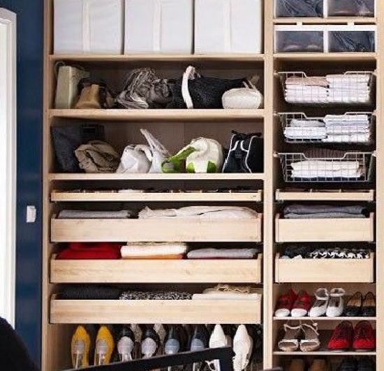 抽屜的功能是將大塊的儲物空間分隔成細小部分,規(guī)劃出各自的私人儲物空間,而滑動收納籃更適合于儲備床單、被罩等大件床上用品、鞋架帶有一定的傾斜度會更方便展示漂亮鞋子。
