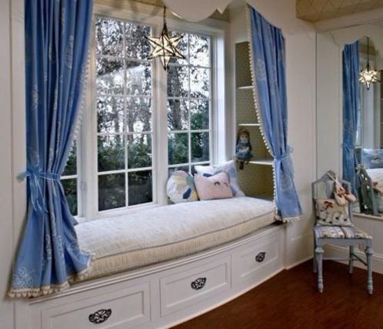 這款飄窗改造位于兒童房,從各方面為兒童設計,星形兒童吊燈不僅美麗,還為夜晚增加光源;內側打造為展示架,可放入各式玩具;窗框特設的蕾絲邊藍色窗簾,為兒童房增添了別致地公主房元素。