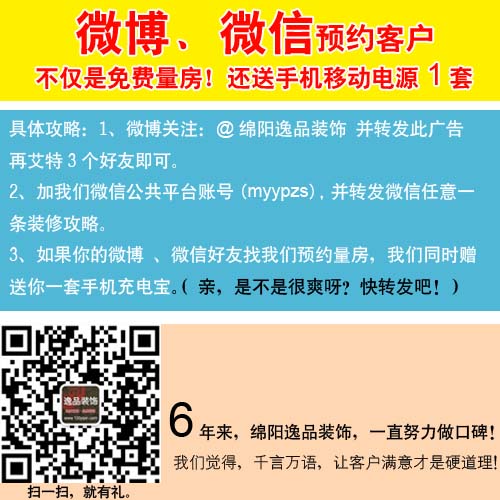 關(guān)注綿陽逸品裝飾官方微信(微信號:myypzs),每天都有精彩的裝修內(nèi)容與你分享。凡通過微信(myypzs)、微博(@綿陽逸品裝飾)預(yù)約量房客戶,送充電寶一個??!