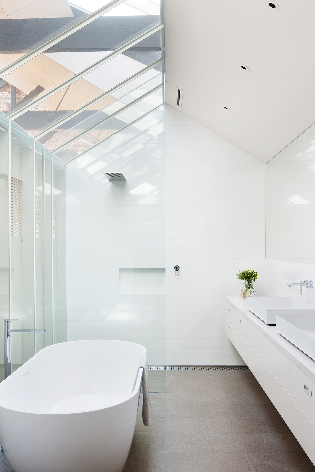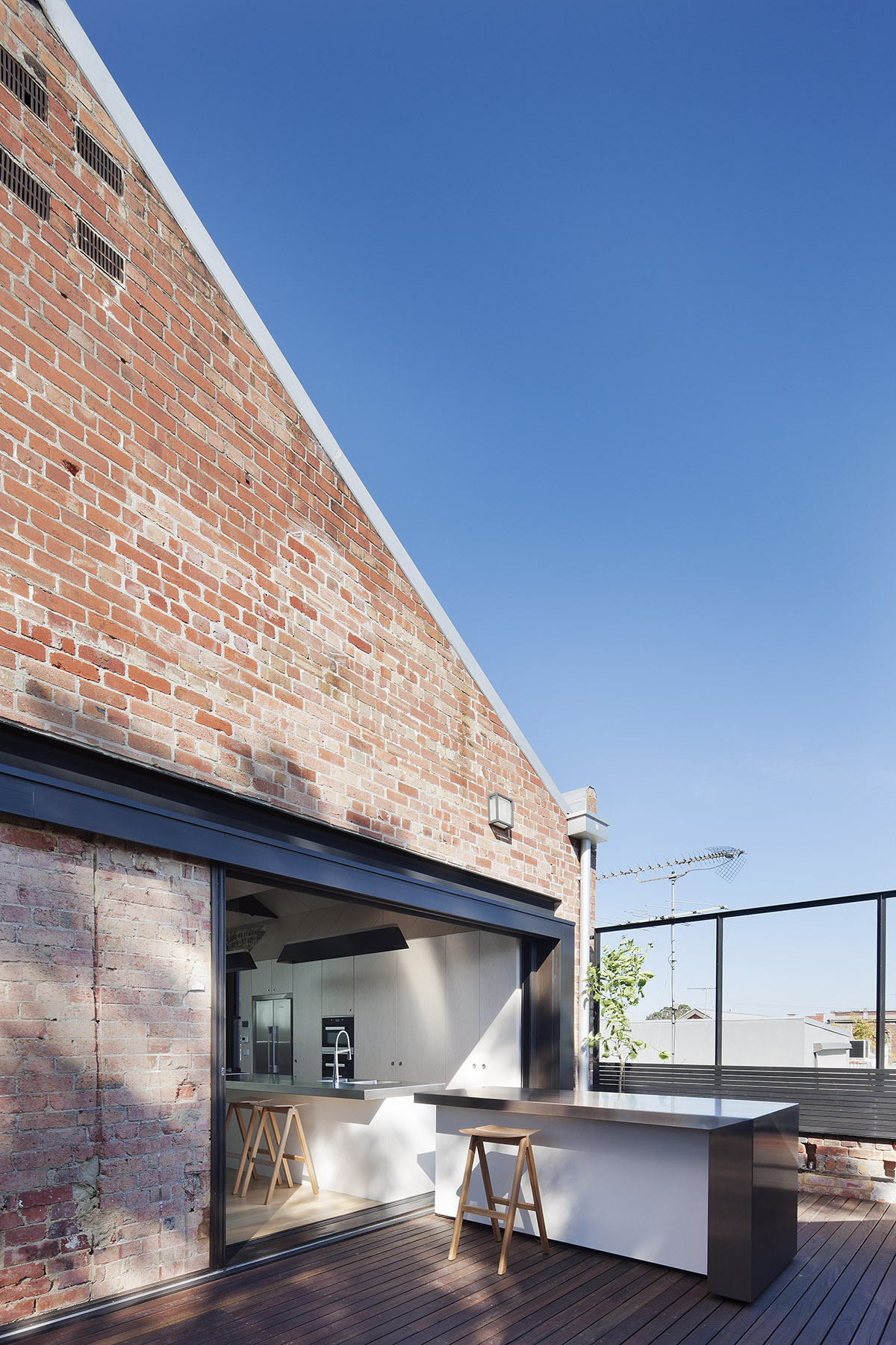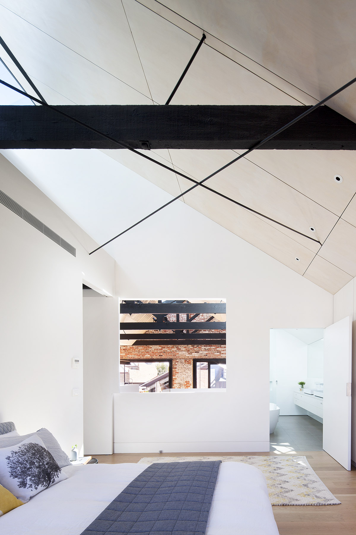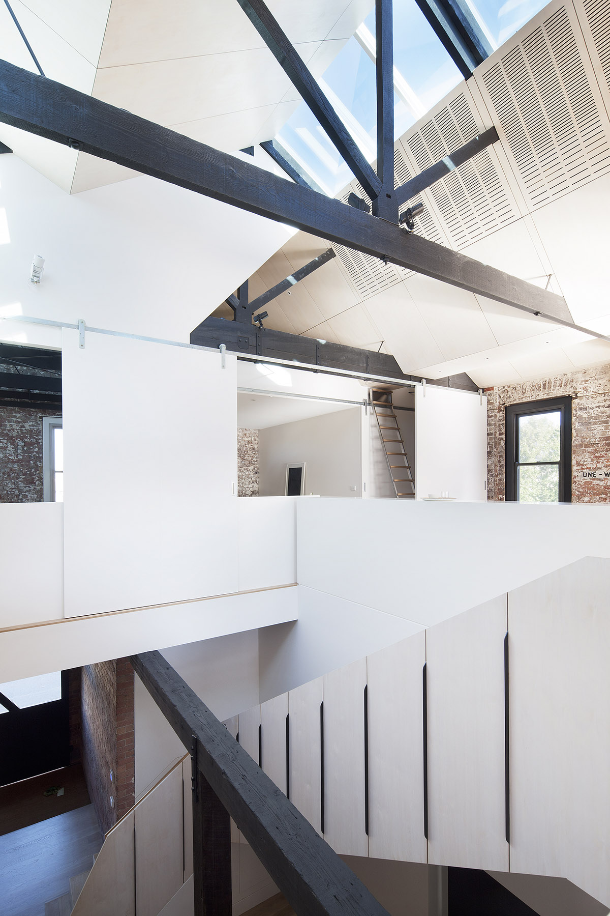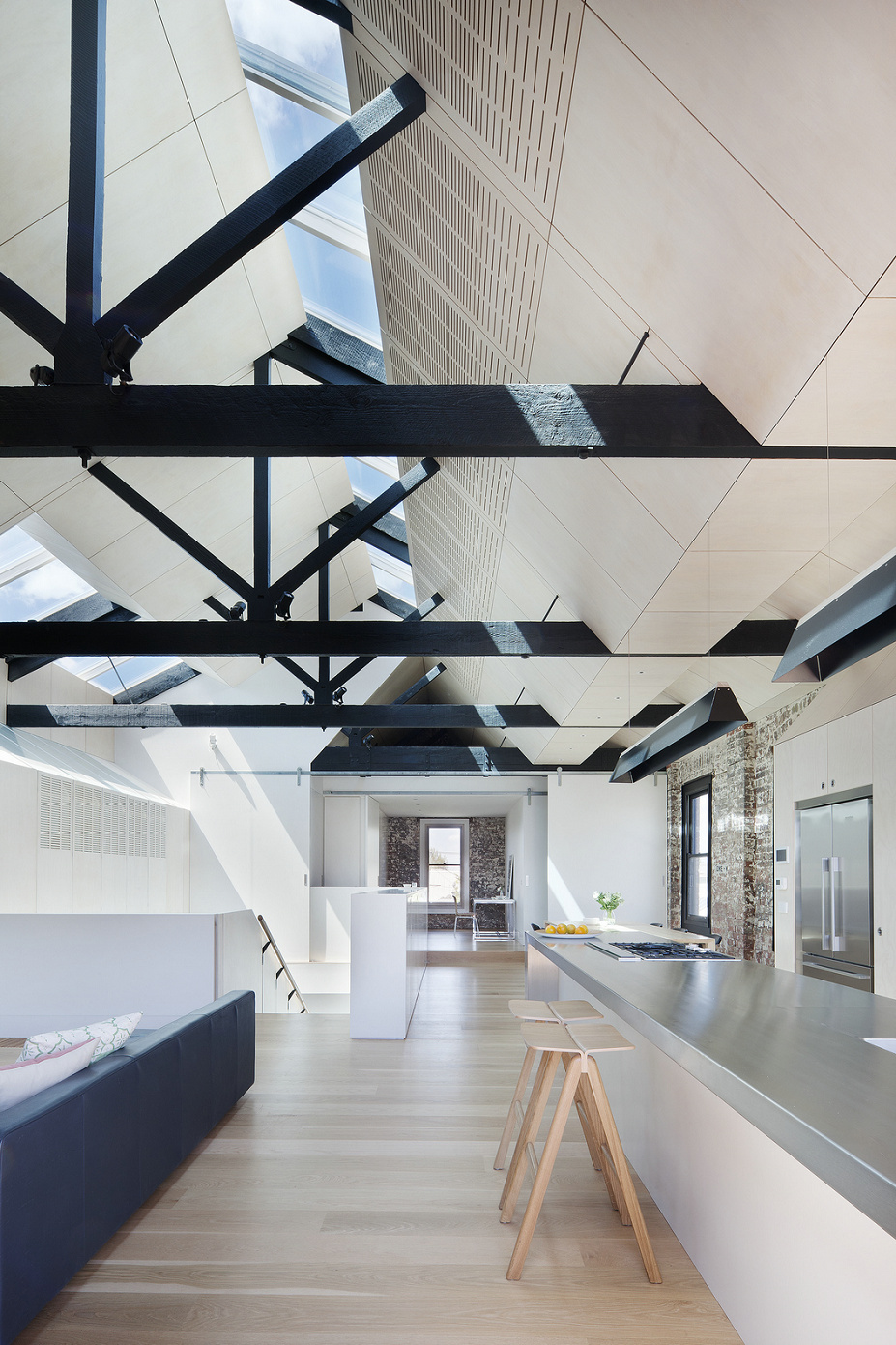 一棟位于19世紀(jì)水廠中的工業(yè)建筑被翻新為寬敞的大住宅。綿陽逸品裝飾的設(shè)計(jì)師利用坡屋頂,并在上面安裝了天窗,讓其變成這個(gè)家的特色與亮點(diǎn),與此同時(shí),從天窗而進(jìn)的光線也讓原本陰暗的空間溫暖明亮。住宅位于正規(guī)矩形排屋中,一側(cè)是巨大的通高車庫,另一側(cè)是居住空間。車庫區(qū)域,坡屋頂上的天窗為空間帶來充沛自然光。居住空間這側(cè)共有兩個(gè)入口,一扇大門與一扇小門,內(nèi)部一道墻將地面層居住空間一分為二,兩個(gè)空間開了一扇滑動(dòng)門。其中一個(gè)空間用于門廳和交通空間,另外一個(gè)空間可作為家庭臨時(shí)使用空間。